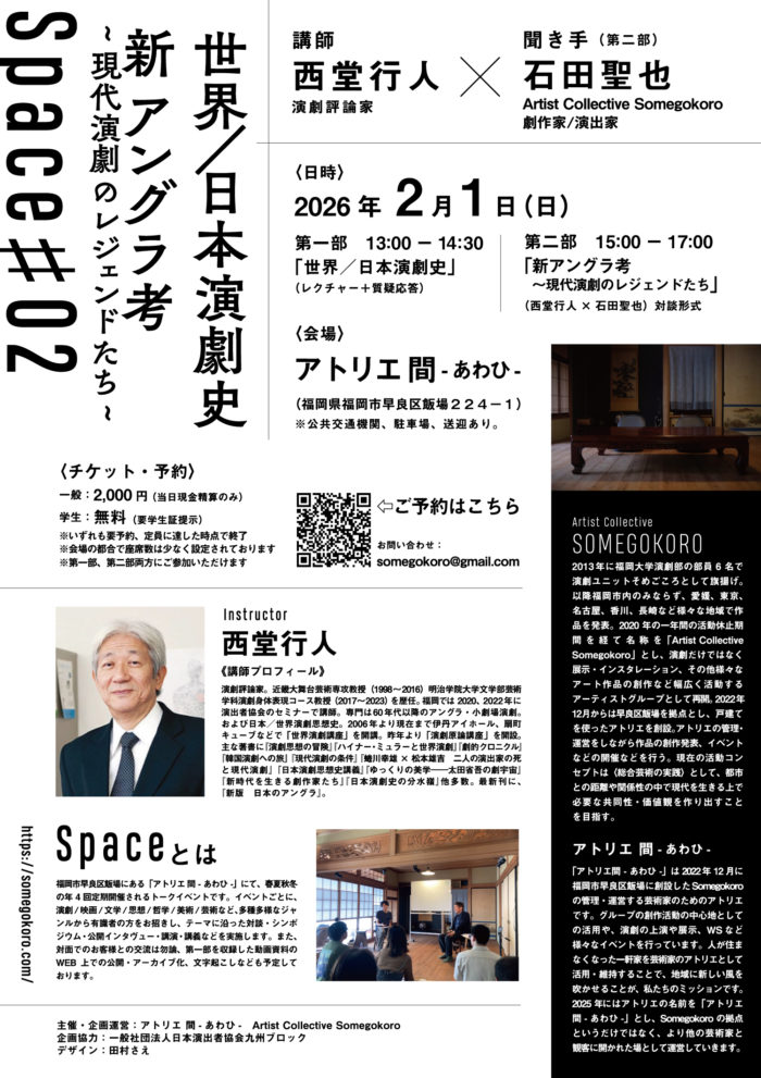 「アトリエ間-あわひ-」は2022年12月に福岡市早良区飯場に創設した、Artist collective somegokoroの管理・運営する芸術家のためのアトリエです。グループの創作活動の中心地としての活用や、演劇の上演や展示、WSなど様々なイベントを行っています。人が住まなくなった一軒家を芸術家のアトリエとして活用・維持することで、地域に新しい風を吹かせることが、私たちのミッションです。2025年にはアトリエの名前を「アトリエ間-あわひ-」とし、somegokoroの拠点というだけではなく、より他の芸術家と観客に開かれた場として運営していきます。