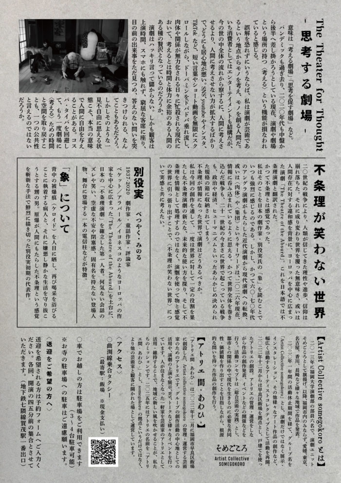 「アトリエ間-あわひ-」は2022年12月に福岡市早良区飯場に創設した、Artist collective somegokoroの管理・運営する芸術家のためのアトリエです。グループの創作活動の中心地としての活用や、演劇の上演や展示、WS、トークなど様々なイベントを行っています。人が住まなくなった一軒家を芸術家のアトリエとして活用・維持することで、地域に新しい風を吹かせることが、私たちのミッションです。2025年にはアトリエの名前を「アトリエ間-あわひ-」とし、somegokoroの拠点というだけではなく、より他の芸術家と観客に開かれた場として運営しています。